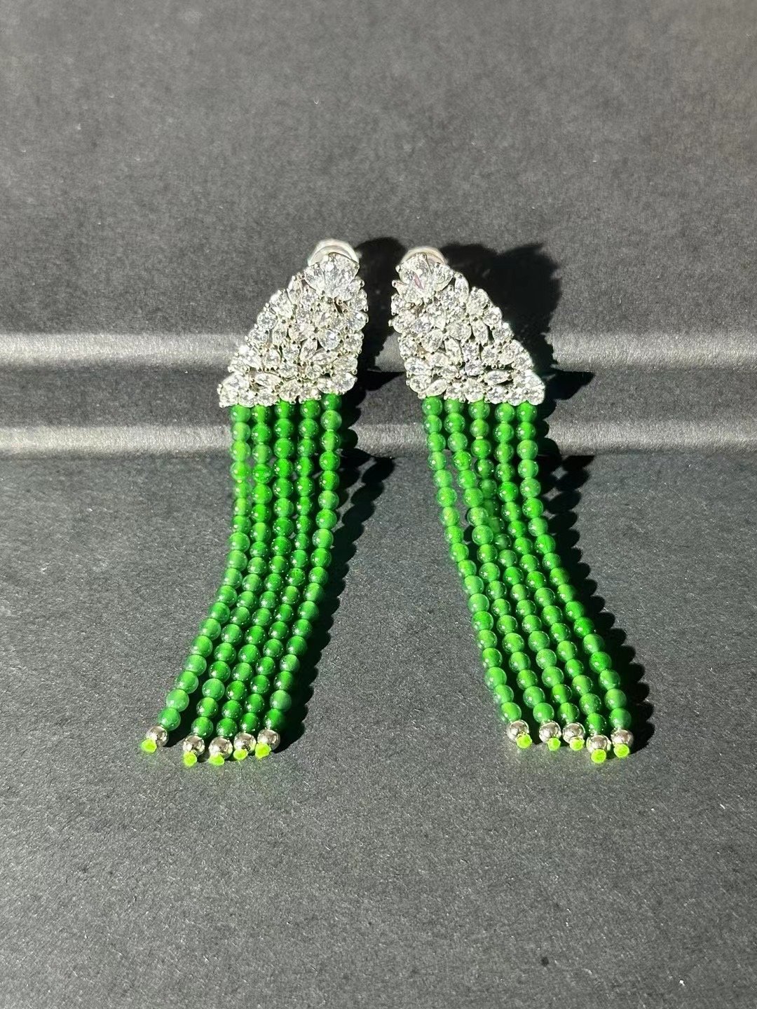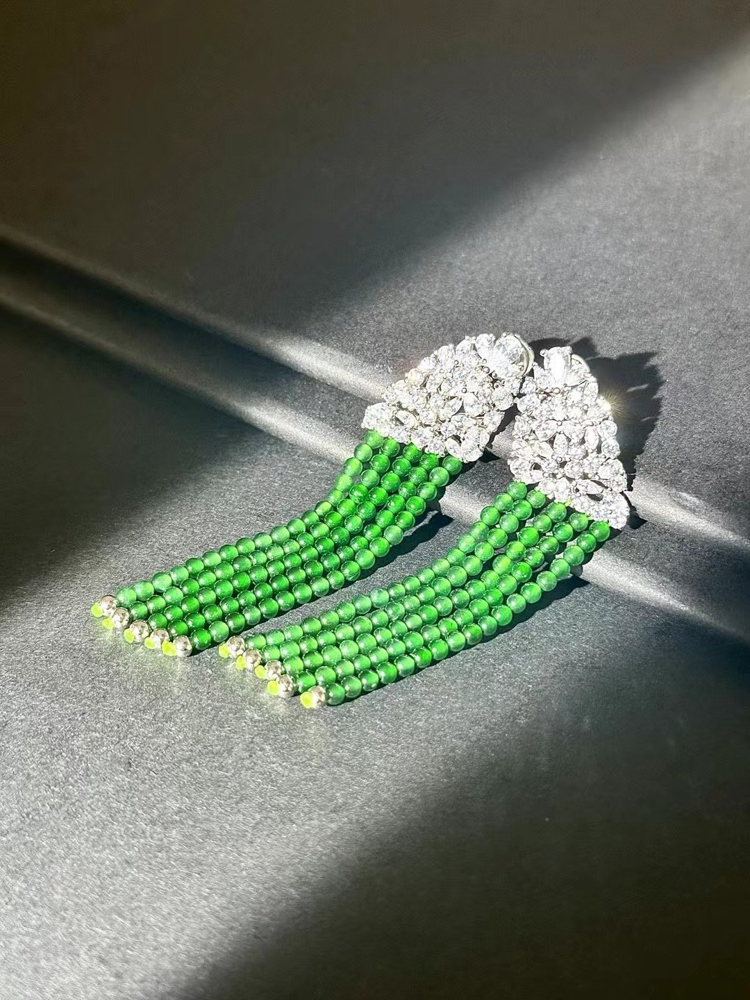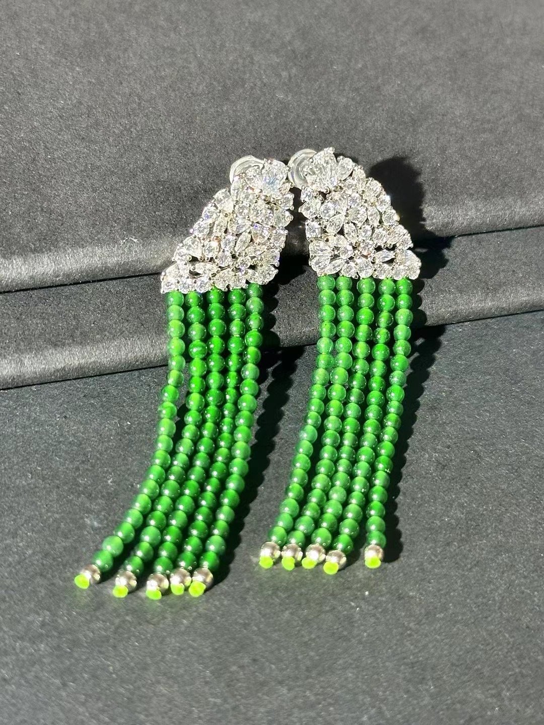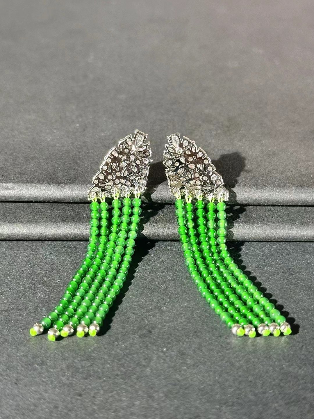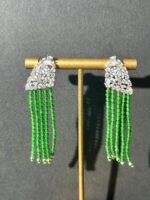 These earrings are stunning! With sparkling accents and cascading green bead tassels, they add instant glamour. Perfect for special occasions or elevating any look.