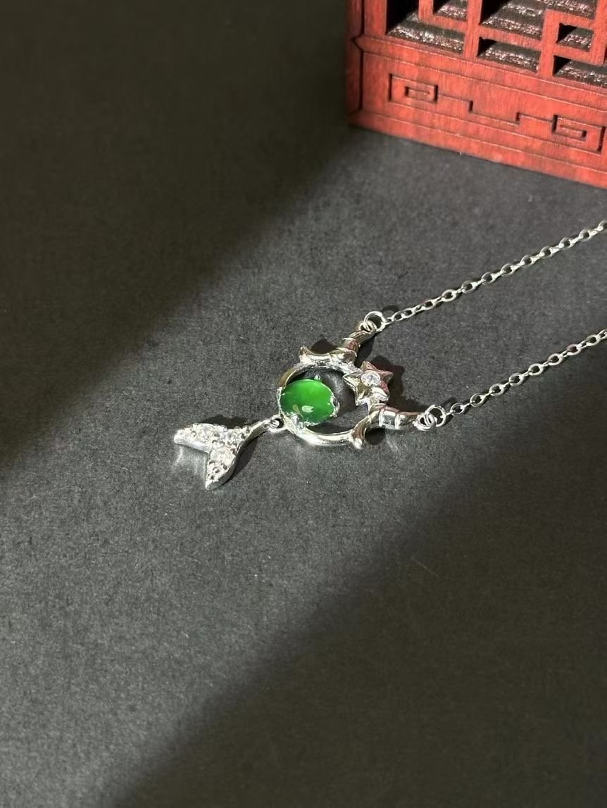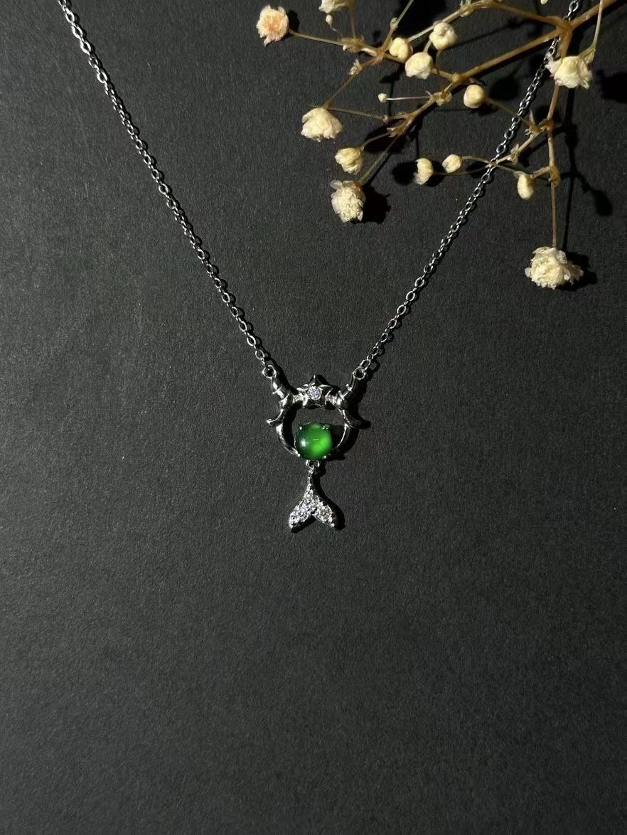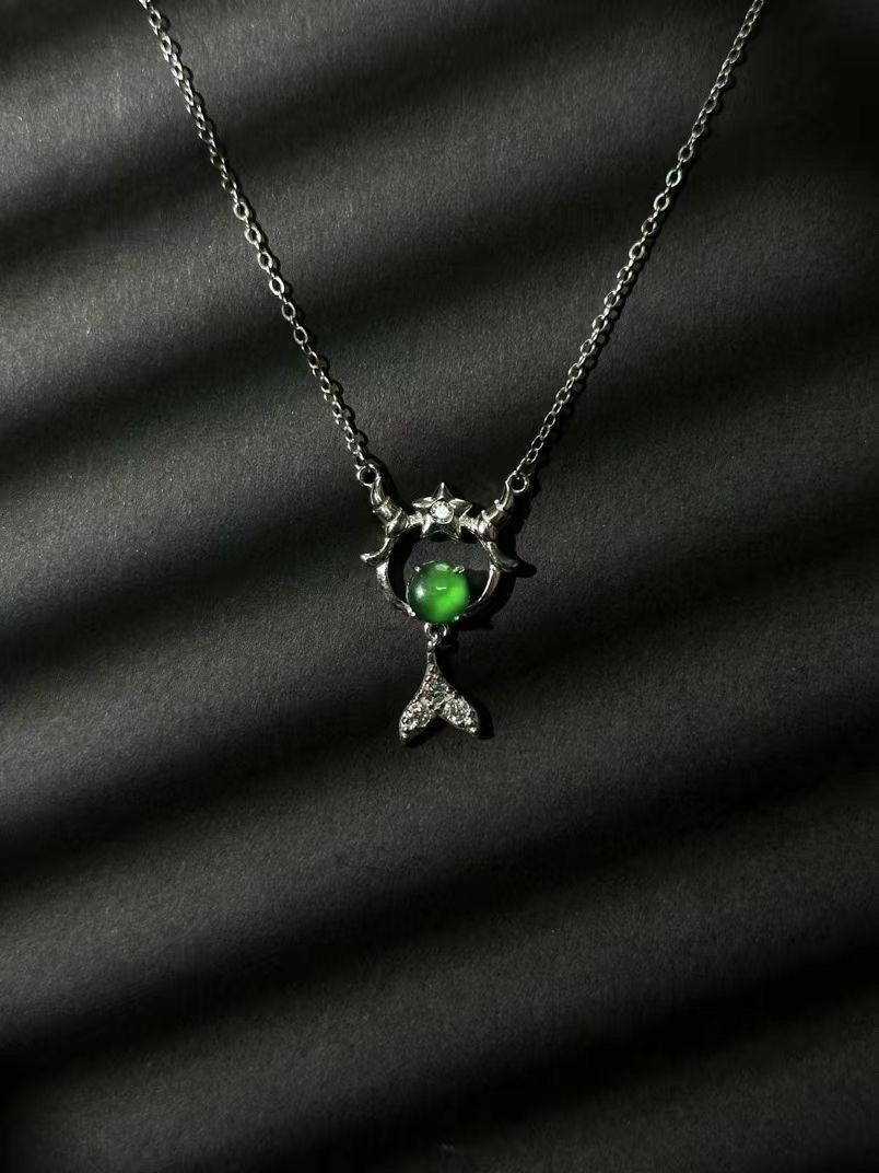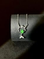Level up your jewelry game with this extraordinary necklace. At its core, a strikingly vibrant green gem commands attention, radiating a rich hue that pops against any skin tone. It’s nestled in an artfully crafted silver setting, featuring intricate detailing that adds a whimsical, almost magical touch. The design balances boldness and elegance – the eye – catching gem makes a statement, while the delicate silverwork keeps it refined. Whether you’re dressing up for a fancy dinner, adding sparkle to a casual outfit, or hunting for a memorable gift, this necklace delivers. It taps into the American love for unique, high – impact accessories that blend quality craftsmanship with standout style. Wear it, and you’ll feel like you’ve got a little piece of luxury that’s as one – of – a – kind as you are.