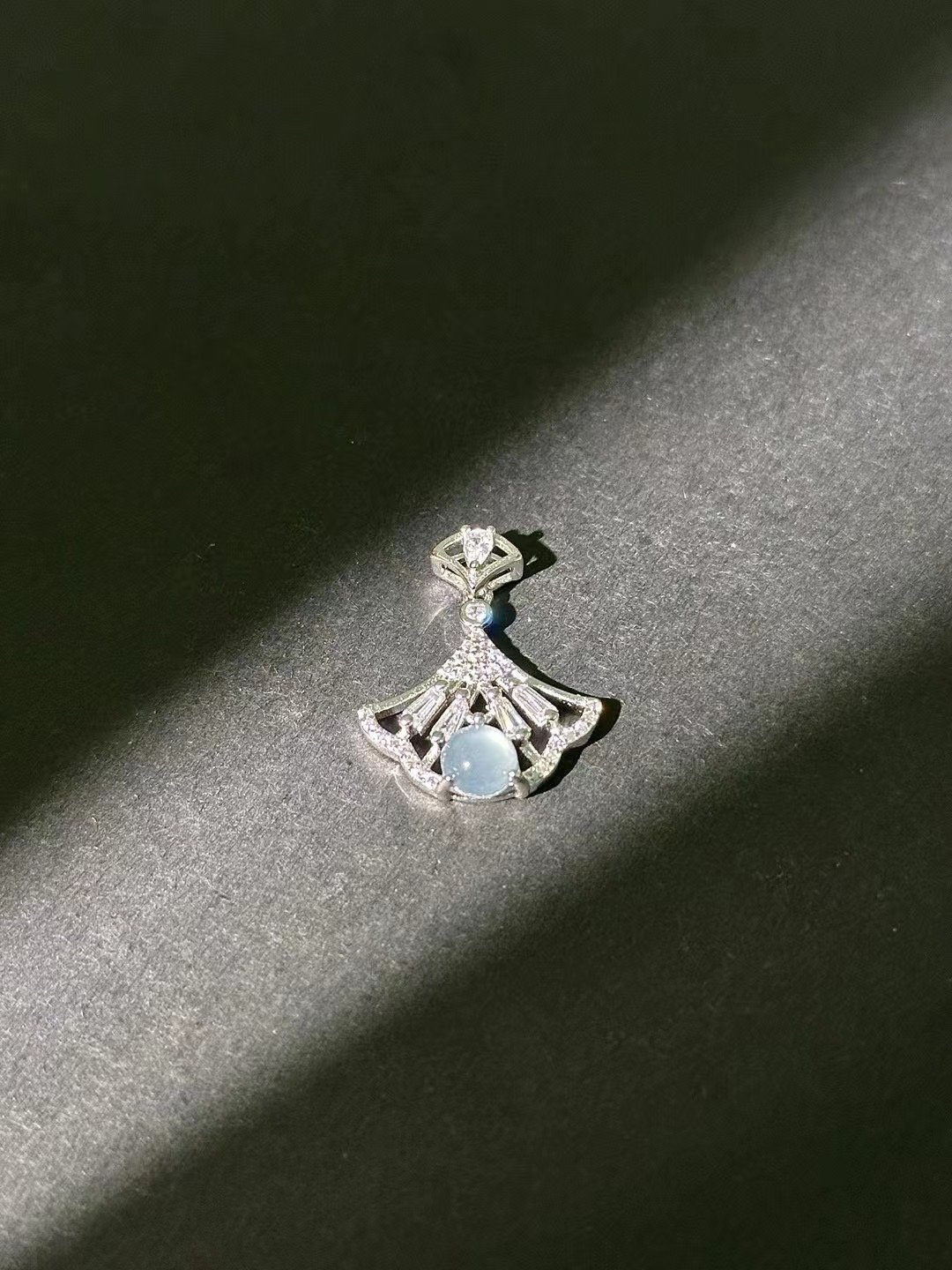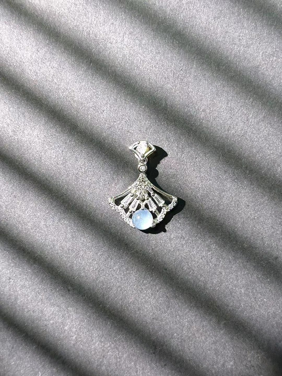 Elevate your jewelry collection with this exquisite fan – shaped pendant. The design showcases a delicate fan silhouette, adorned with sparkling accents that catch the light beautifully. At its center, a light blue gem adds a soft, luminous touch, enhancing the pendant’s elegant appearance. Crafted with attention to detail, it hangs gracefully, making it a standout piece.