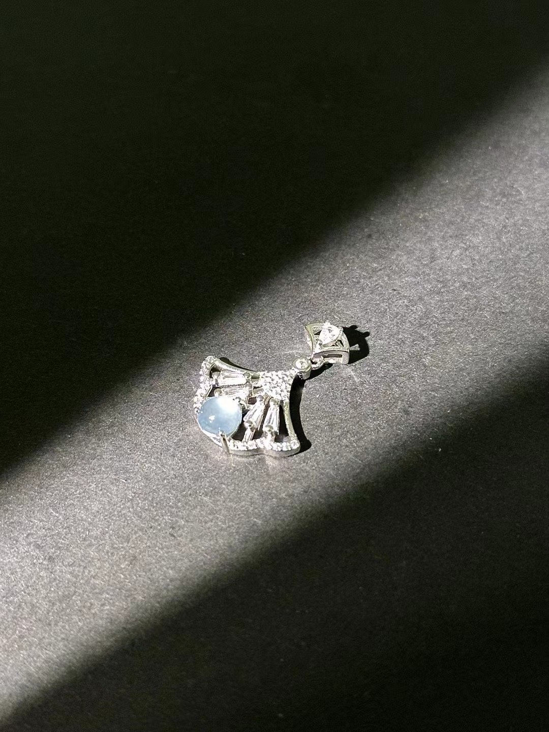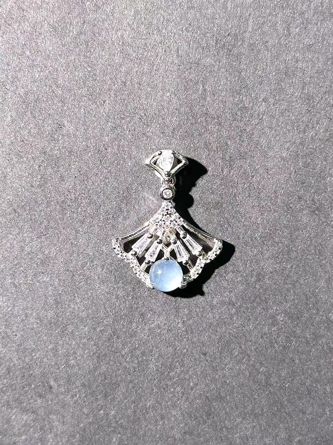 This pendant is gorgeous! Featuring a fan – shaped design with a light blue gem and sparkling accents, it adds a touch of elegance. Perfect for gifting or elevating your style.