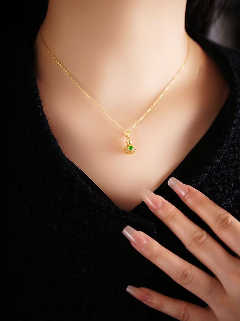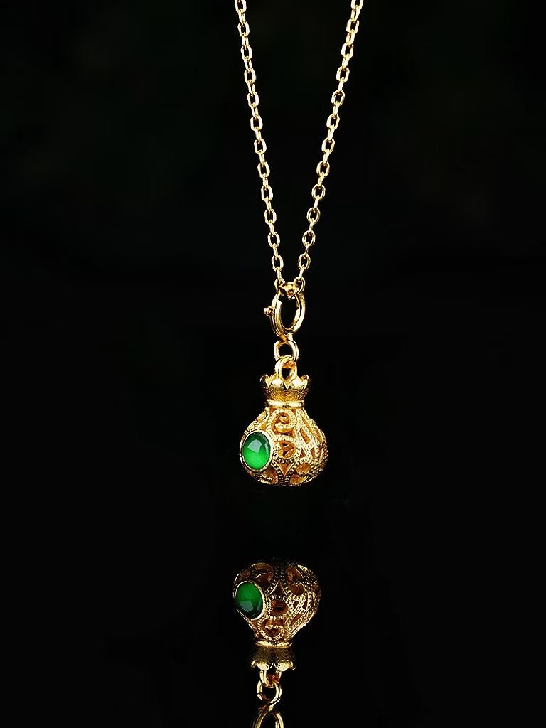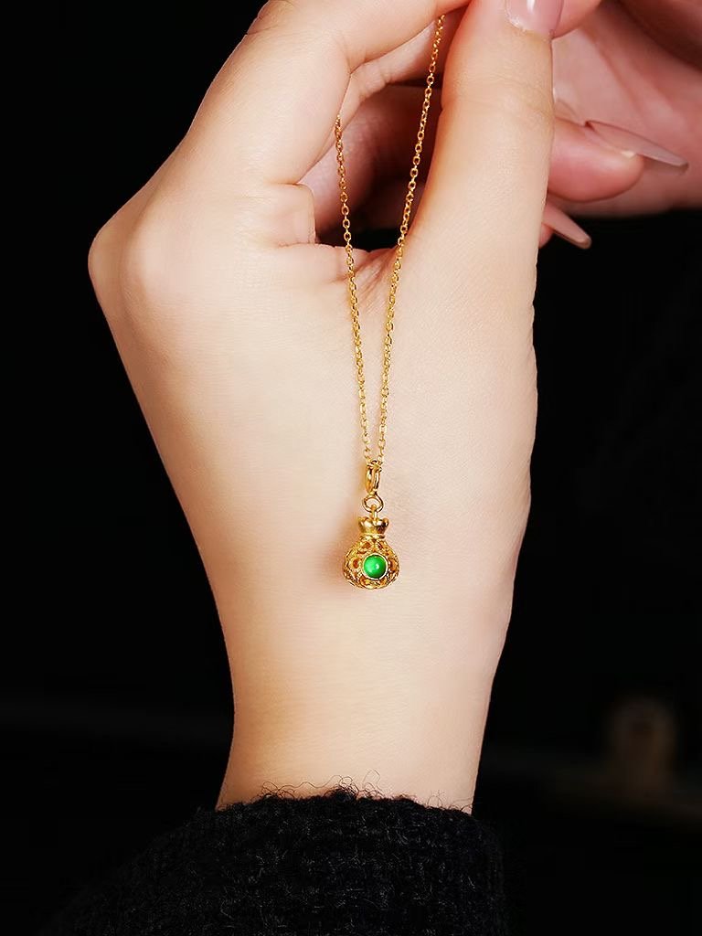 This necklace is beautiful! It features a golden money bag – shaped pendant with a vibrant green gem, symbolizing good fortune. Perfect for gifting or adding a touch of elegance to your look.