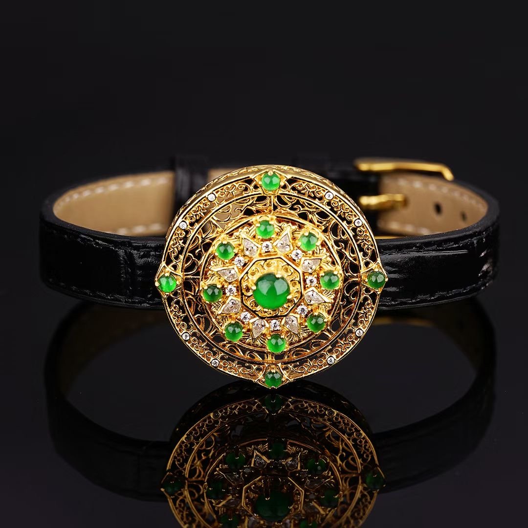 This necklace is pure luxury! A gold – toned, intricate circular pendant with vibrant green gems and tiny sparkles. Perfect for adding a bold, elegant touch—ideal for special events or dressing up any look.