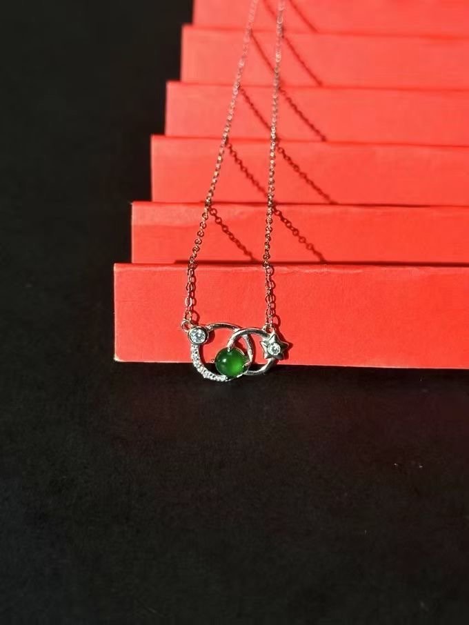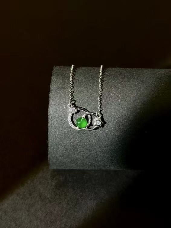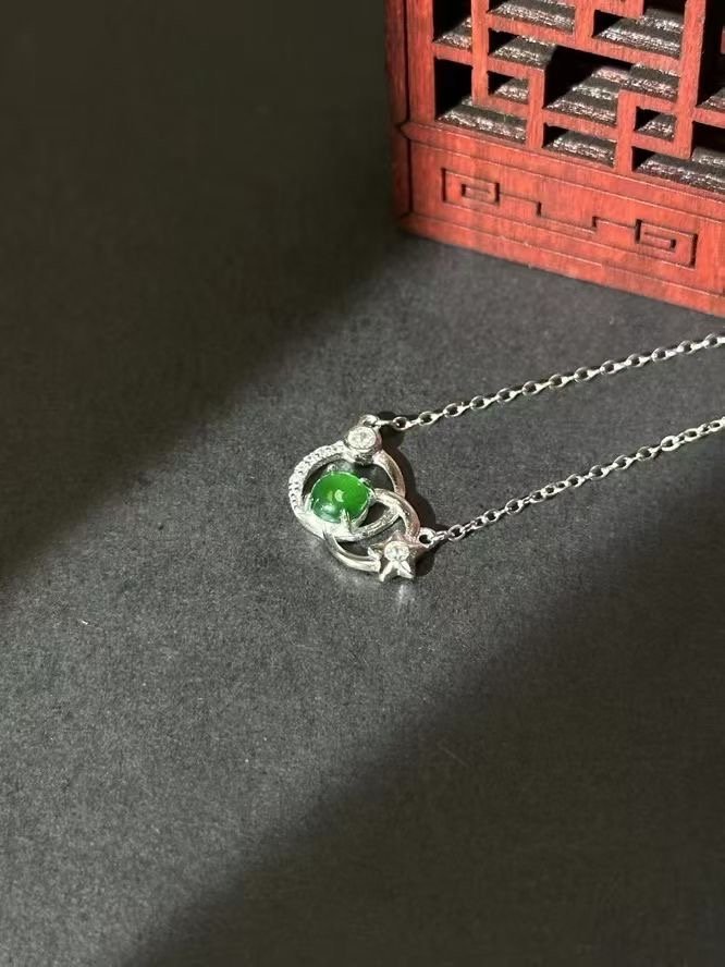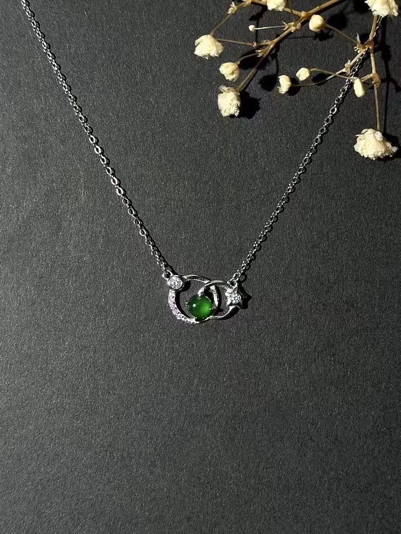 A necklace with a vivid green gem at its center, surrounded by sleek silver – moon and star motifs. Instantly adds a touch of celestial – inspired elegance to any look.
