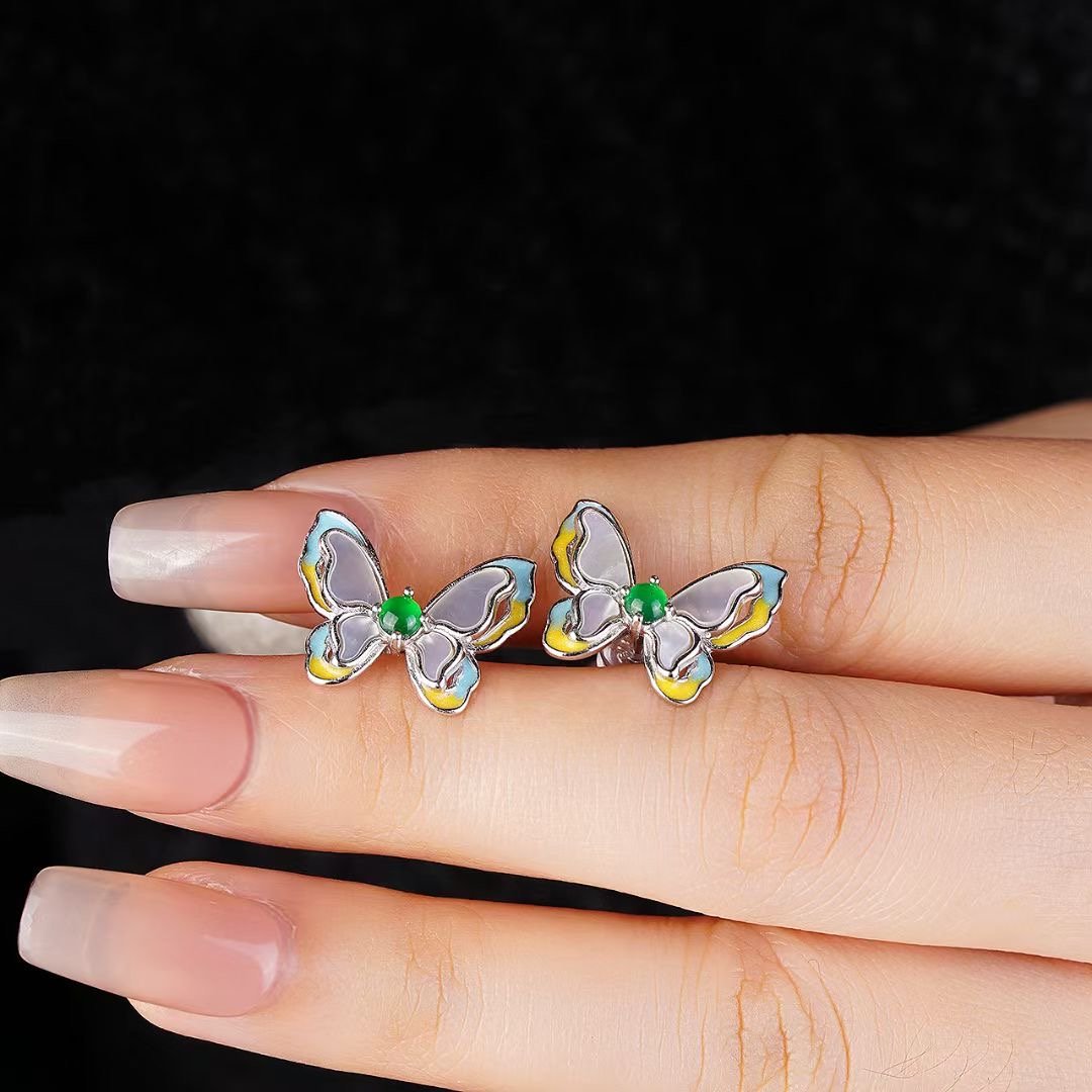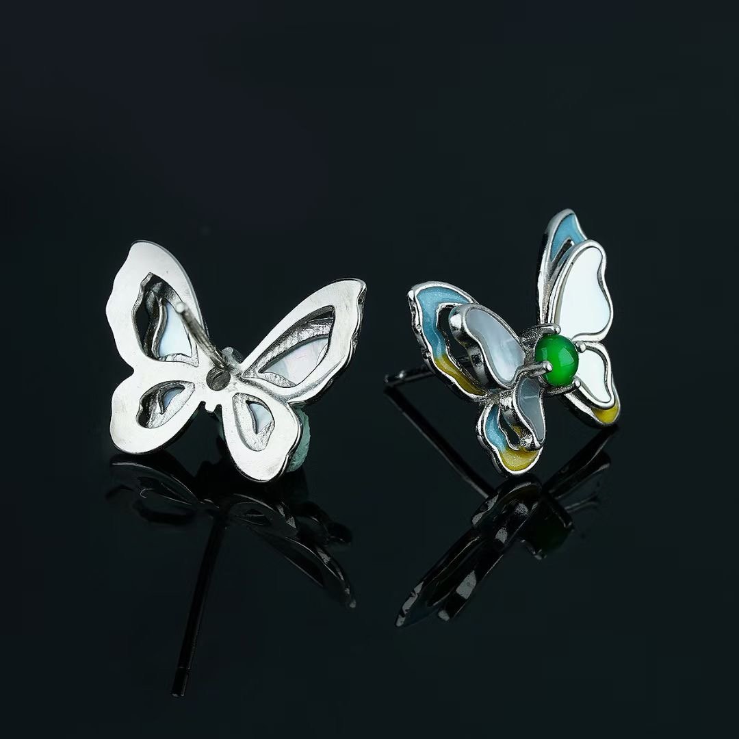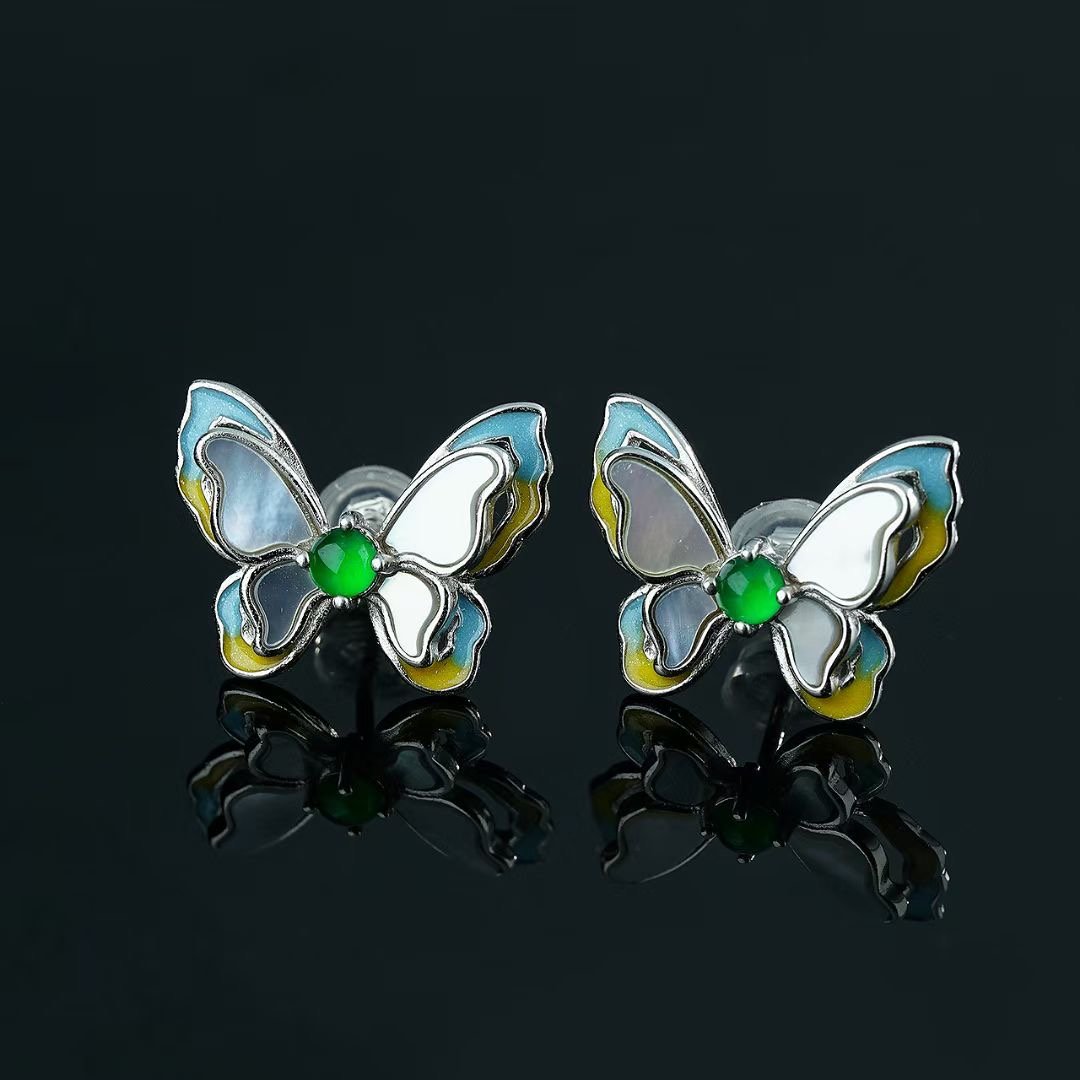 myglowjewels“Boho Chic Butterfly Studs with Mother – of – Pearl & Green Gem – Dainty Silver – Plated Earrings for Everyday Elegance | Perfect Gift for Her”