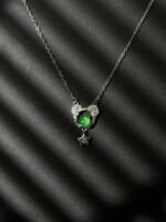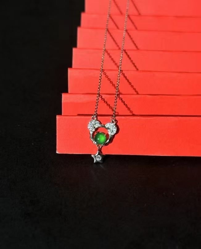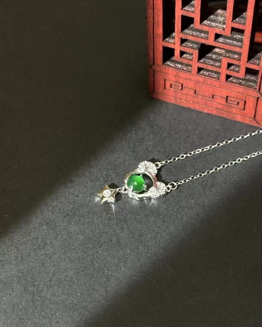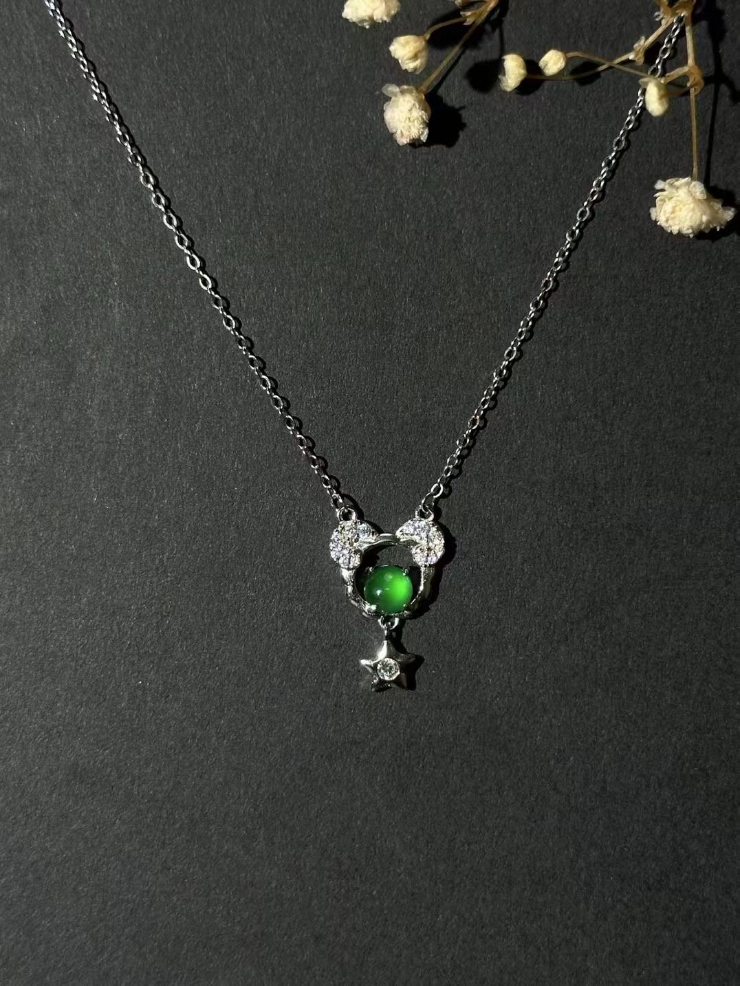 一条银质项链,主体是镶嵌绿宝石的可爱造型,搭配小钻与星星坠饰,简约又精致,轻松点亮穿搭。